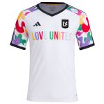• Designed to celebrate love, this LAFC 2023 Pride Pre-Match Top from adidas is a great, new look for match day. It features a colorful pattern on the sleeves and “Love Unites” graphics across the chest, complementing the monochrome LAFC logo. The AEROREADY technology absorbs moisture and the ventilated mesh inserts offer extra breathability, keeping you comfortable while you cheer for your squad.